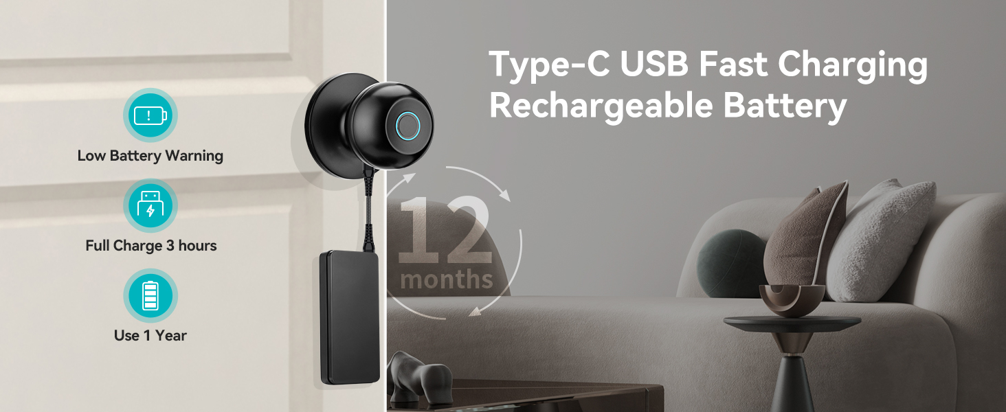 Rechargeable: The LEELEN fingerprint door lock has a built-in 400mAh rechargeable battery that takes 3 hours to charge fully and can last up to 12 months.